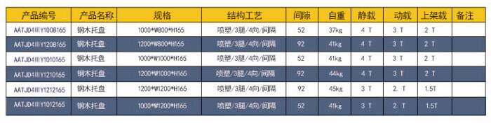 四向三腿——鋼木托盤 技術(shù)參數(shù)說(shuō)明: 產(chǎn)品編號(hào): AATJD4ⅢY1212165 產(chǎn)品規(guī)格: 1200*1200*165 產(chǎn)品自重: 45kg 防銹工藝: 靜電沙紋噴塑 產(chǎn)品靜載: 3000KG(均勻載重) 產(chǎn)品動(dòng)載: 2500KG(均勻載重) 產(chǎn)品上架: 1500KG(均勻載重) 主要用途: 倉(cāng)庫(kù)、車間周轉(zhuǎn)、高庫(kù)物流倉(cāng)儲(chǔ)