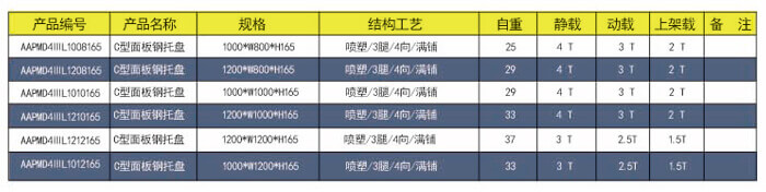 四向三腿——C型面板鋼托盤 技術參數說明: 產品編號: AAPMD4ⅢL1210165 產品規格: 1200*1000*165 產品自重: 33kg 防銹工藝: 靜電沙紋噴塑 產品靜載: 3000KG(均勻載重) 產品動載: 2500KG(均勻載重) 產品上架: 1500KG(均勻載重) 主要用途: 倉庫、車間周轉、物流倉儲