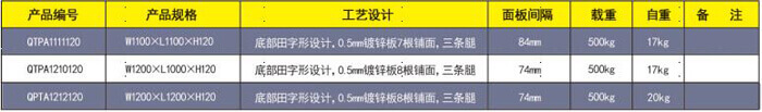 產品編號:QTPA1111120 產品規格:W1100×L1100×H120 托盤主孔:100mm 托盤側孔:80 mm 產品自重:16 kg 產品靜載:800kg 產品動載:600kg 上貨架載:不建議 產品配置:采用寶鋼鍍鋅板軋機成0.5*10*85 多筋骨面板10根,以間隔84mm 和6根板做腿+9個立撐組成。 產品用途:廣泛用于酒水、食品、化工、電子 等大量物品倉儲與周轉。 產品缺陷:不宜上貨架。