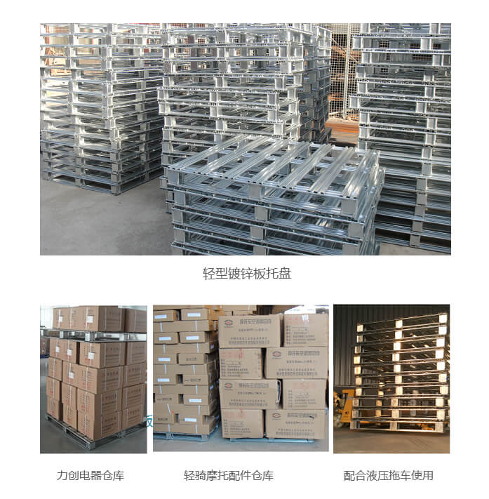 輕型A型鍍鋅板托盤 產品用途: 本產品采用上海寶鋼大鋅花0.5—1.0mm厚的鍍鋅板軋壓變形,優點質量輕承重好,焊點處涂銀粉油漆或植物桐油防止焊點生銹。應本產品熱鍍鋅層面工藝,防銹能力非常強,廣泛用于輕工業制造,如冷鏈、食品車間生產、酒水制造,電子制造倉儲與周轉。對比木板托盤免熏蒸,常作為隨貨底托,隨產品一次性出口。提示:不建議上貨架,如上貨架,主材厚度1.2mm。
